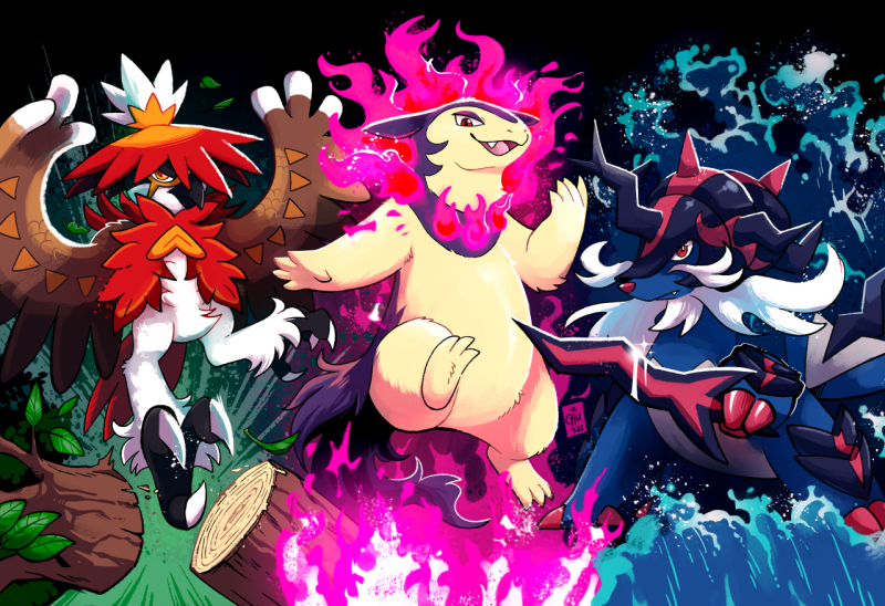 A premium luster print poster featuring Hisuian Decidueye, Hisuian Typhlosion, and Hisuian Samurott!