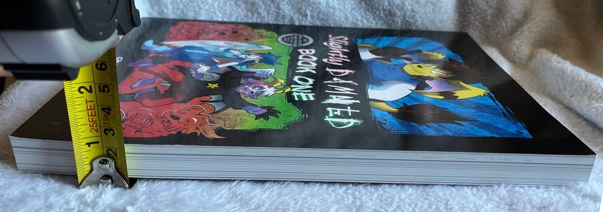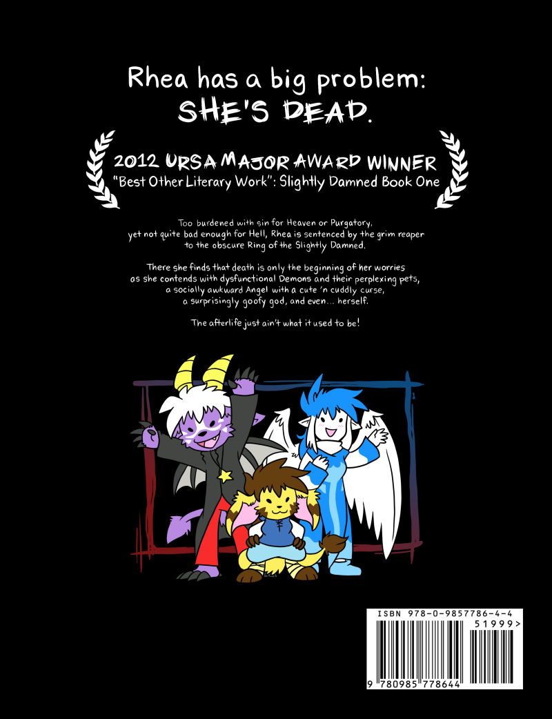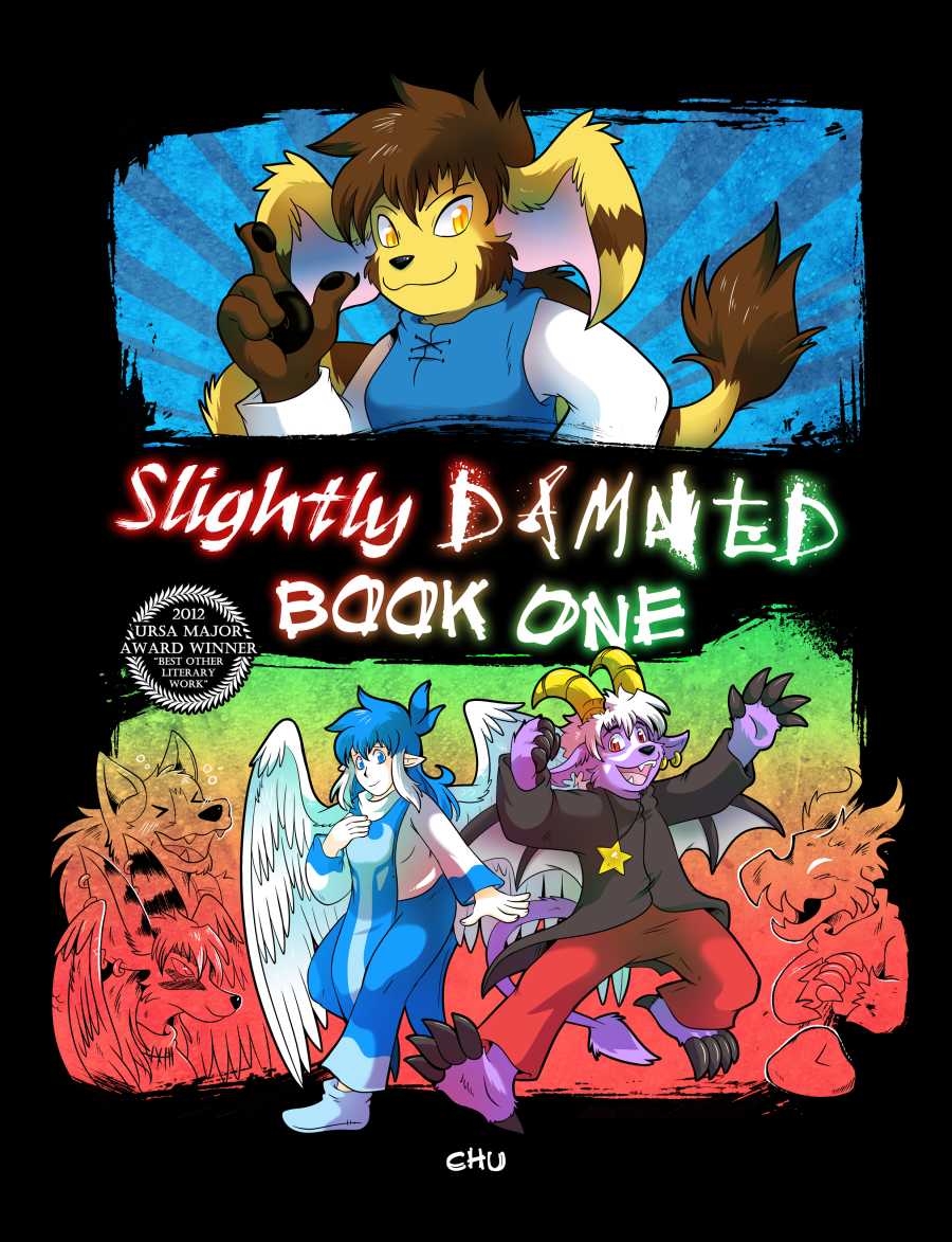 Slightly Damned: Book One contains original comic pages #1 through #187 improved word balloons and new chapter covers. There is exclusive content at the back of the book not available elsewhere, like 4-panel comic strips and bonus pages!